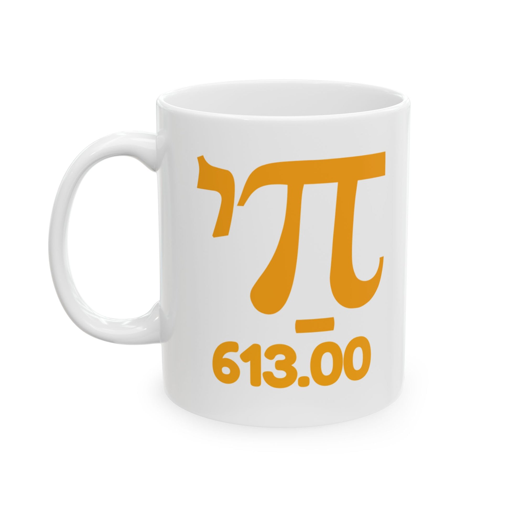 Sip with soul and a side of smarts. Our "חי 613" mug is a clever nod to Jewish tradition, blending deep meaning with a playful twist. The Hebrew word חי (Chai) — symbolizing life — is styled to resemble the π (pi) symbol, giving this design a modern, geek-chic flair. Below it sits 613, representing the total number of mitzvot (commandments) in the Torah.