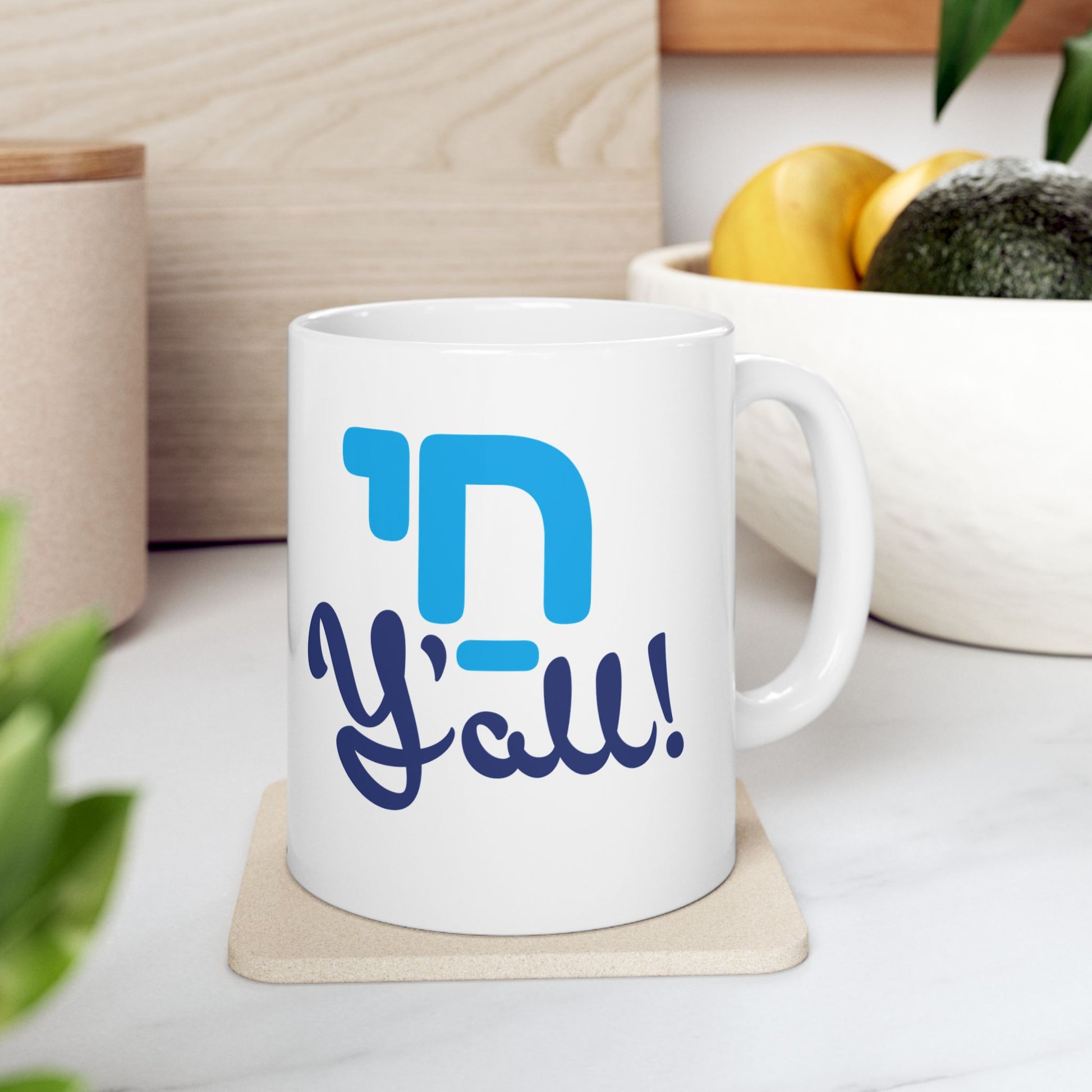 This mug says it all — חי Y’all — a warm welcome with a soulful twist. Featuring the iconic Hebrew word חי (“chai,” meaning life) paired with a good ol’ Southern “y’all,” it’s a design that celebrates living fully and loving freely.