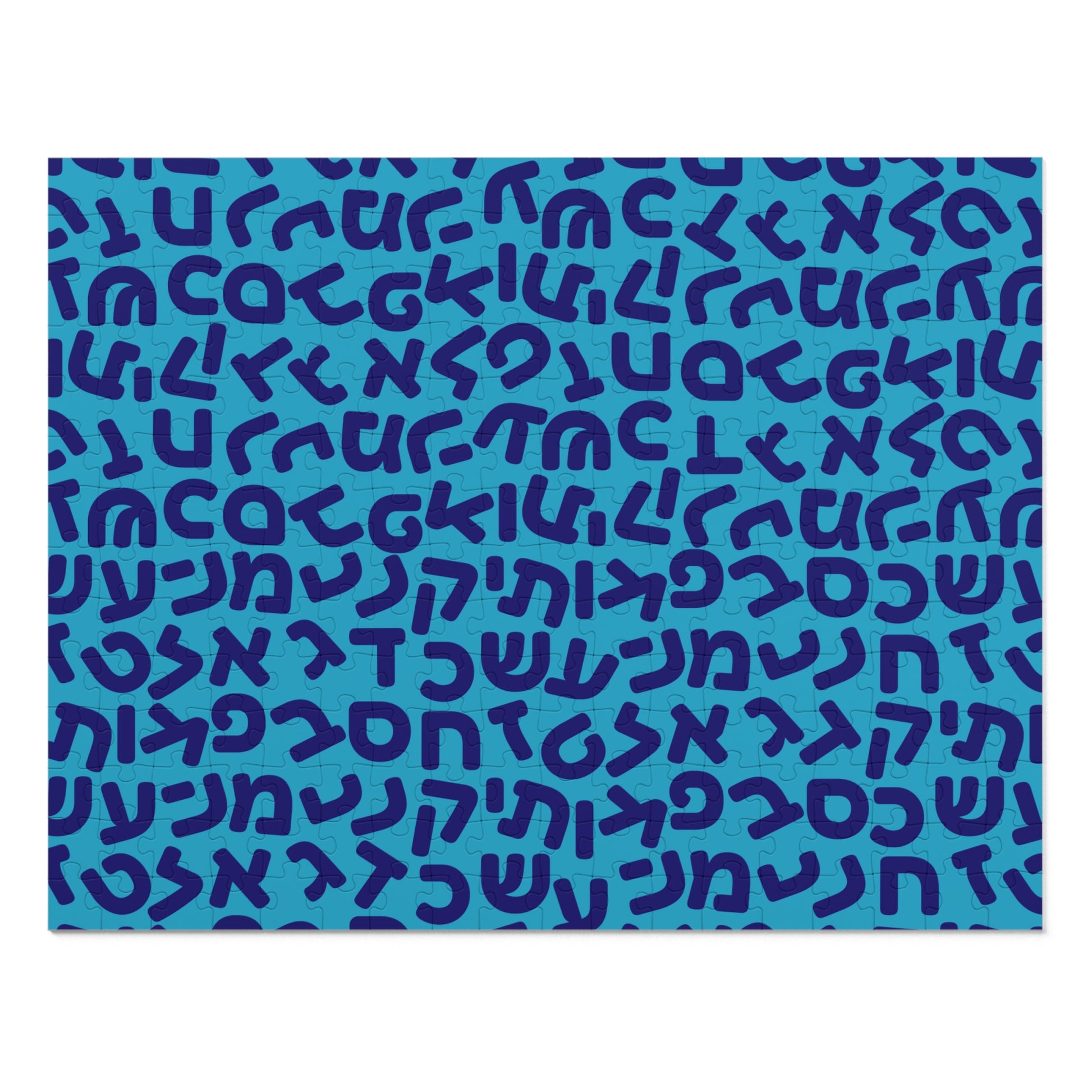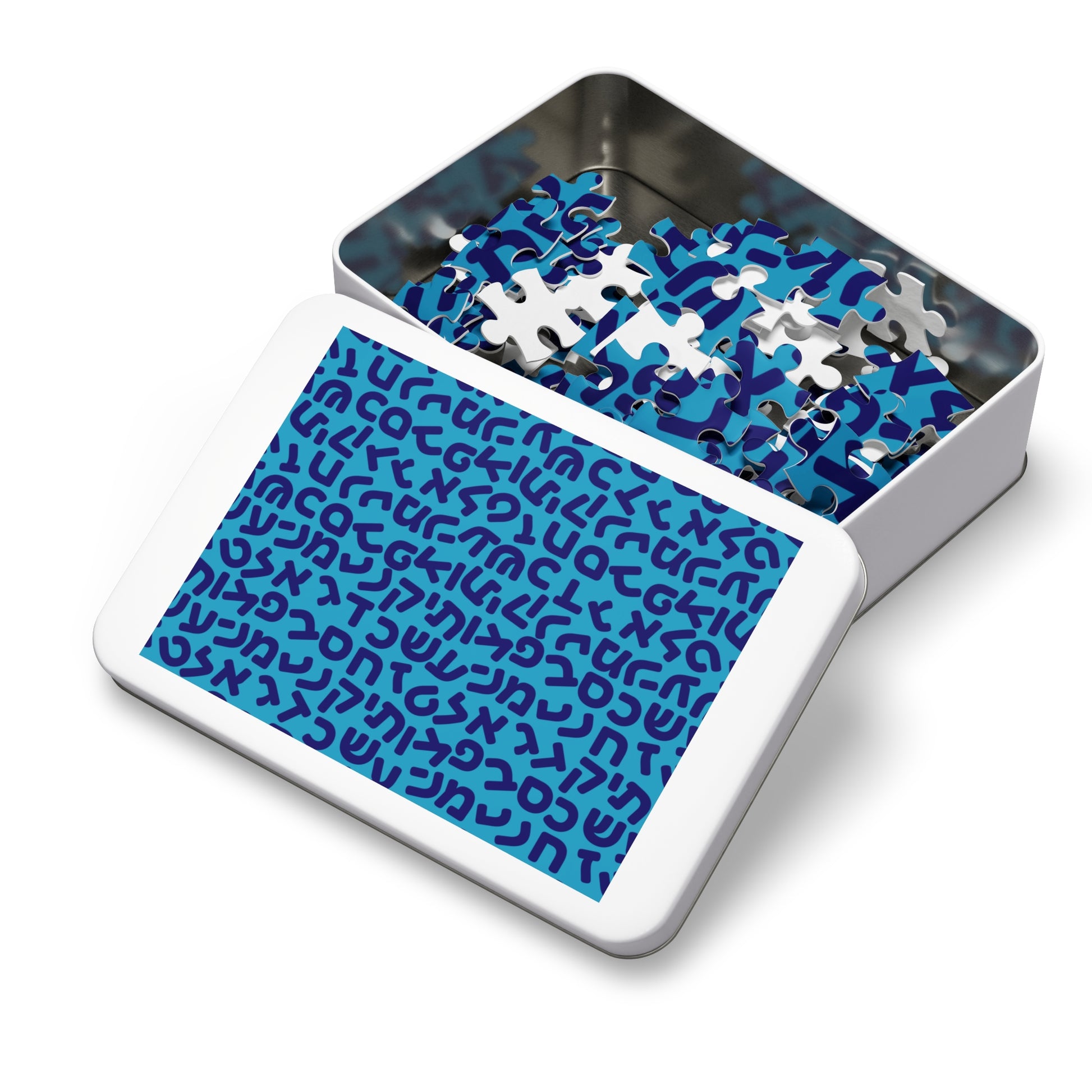 🧩 Jumbled Hebrew Letters Blue Jigsaw Puzzle with Collectible Tin