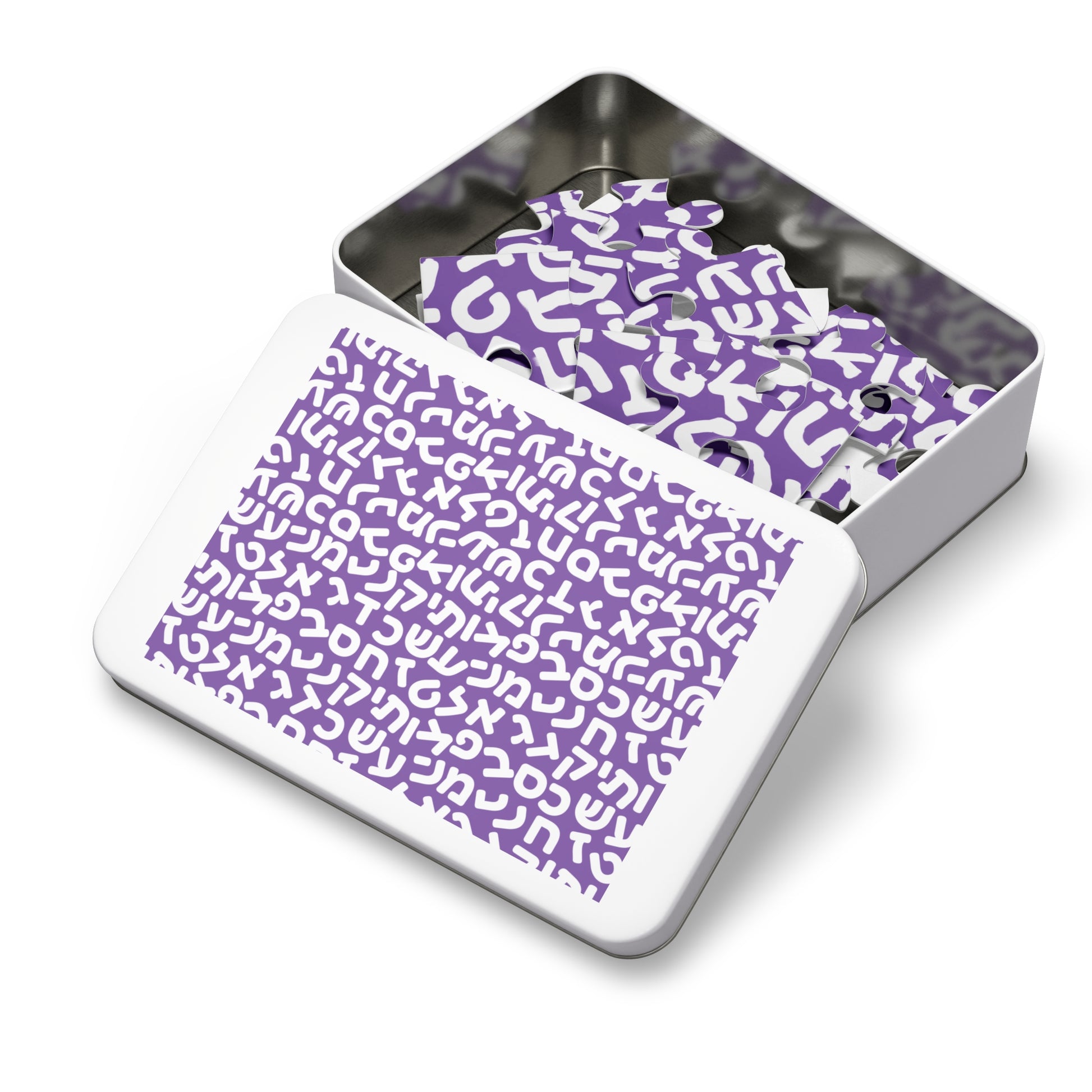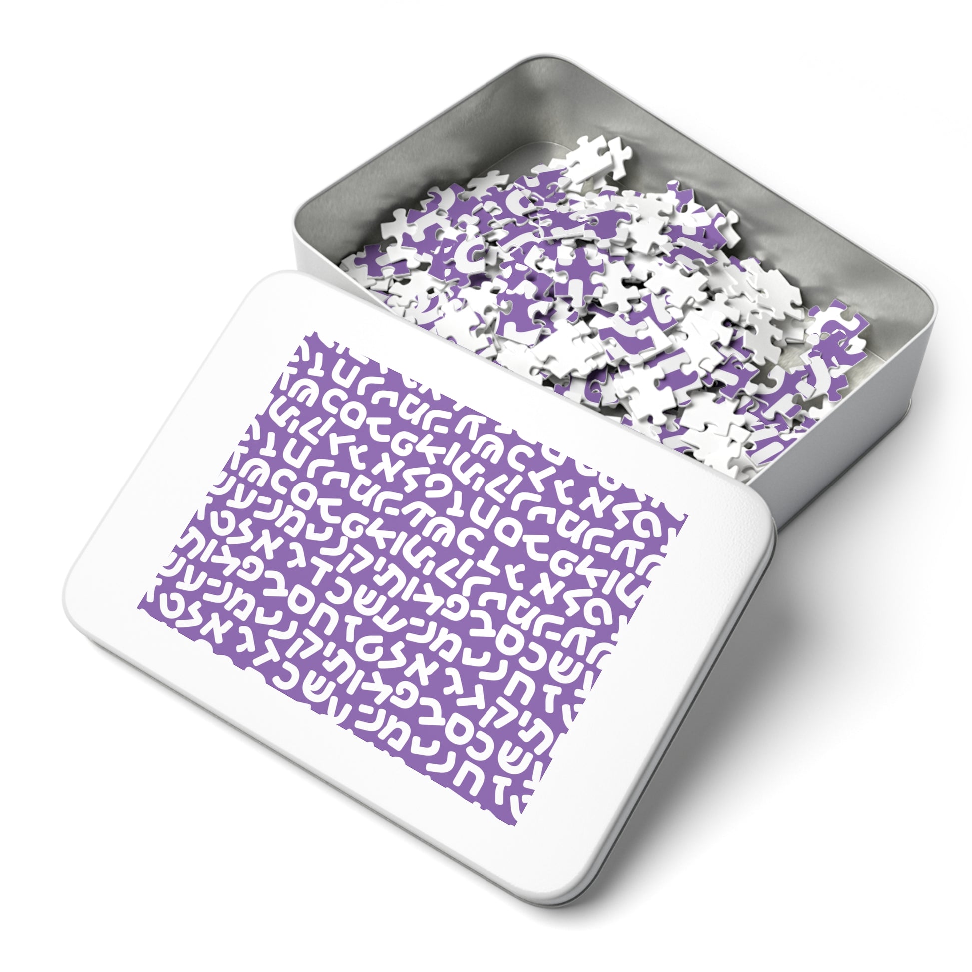 🧩 Jumbled Hebrew Letters Purple Jigsaw Puzzle with Collectible Tin