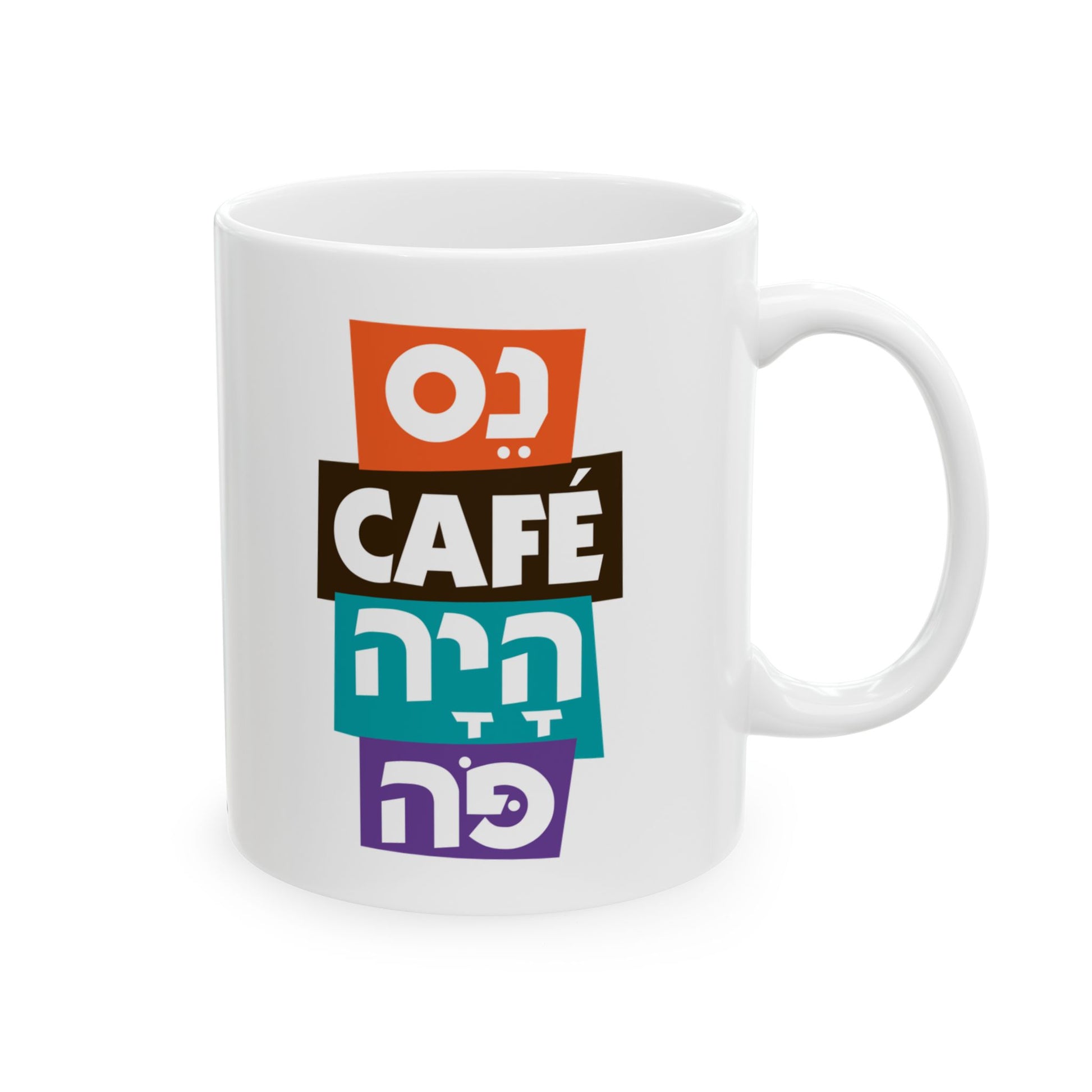 Start your mornings with a miracle — and a strong cup of coffee. Our נס Café היה פה mug puts a caffeinated twist on the classic Chanukah phrase “נס גדול היה פה” (A great miracle happened here), replacing the “גדול” with a bold Café for those who know that sometimes, coffee itself is the miracle.
