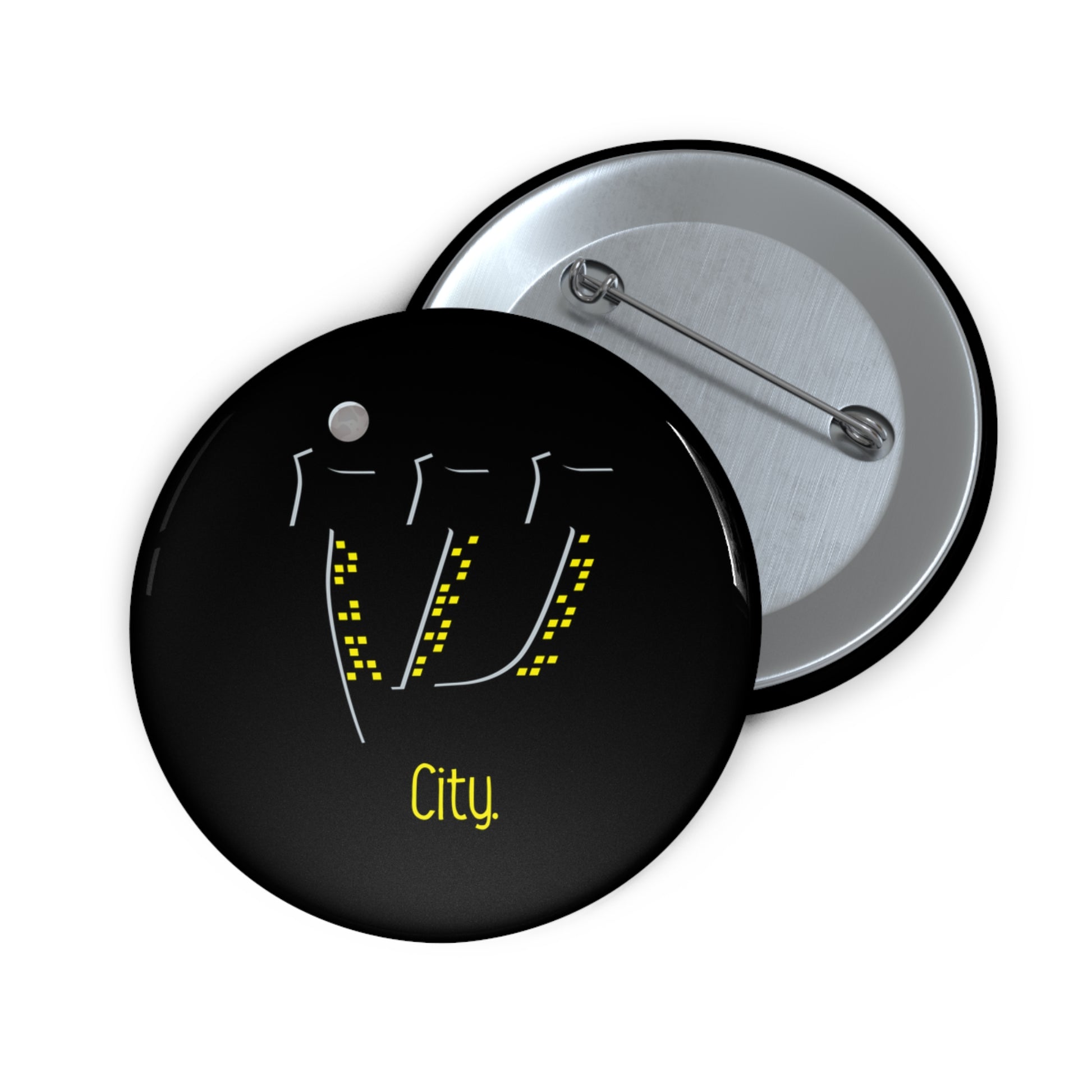 This striking button features the Hebrew letter שׂ (Sin) glowing against a deep black background, reimagined as a nighttime skyline. Tiny lit windows turn each stroke of the letter into a towering building, while the dagesh doubles as a bright moon hanging in the sky.