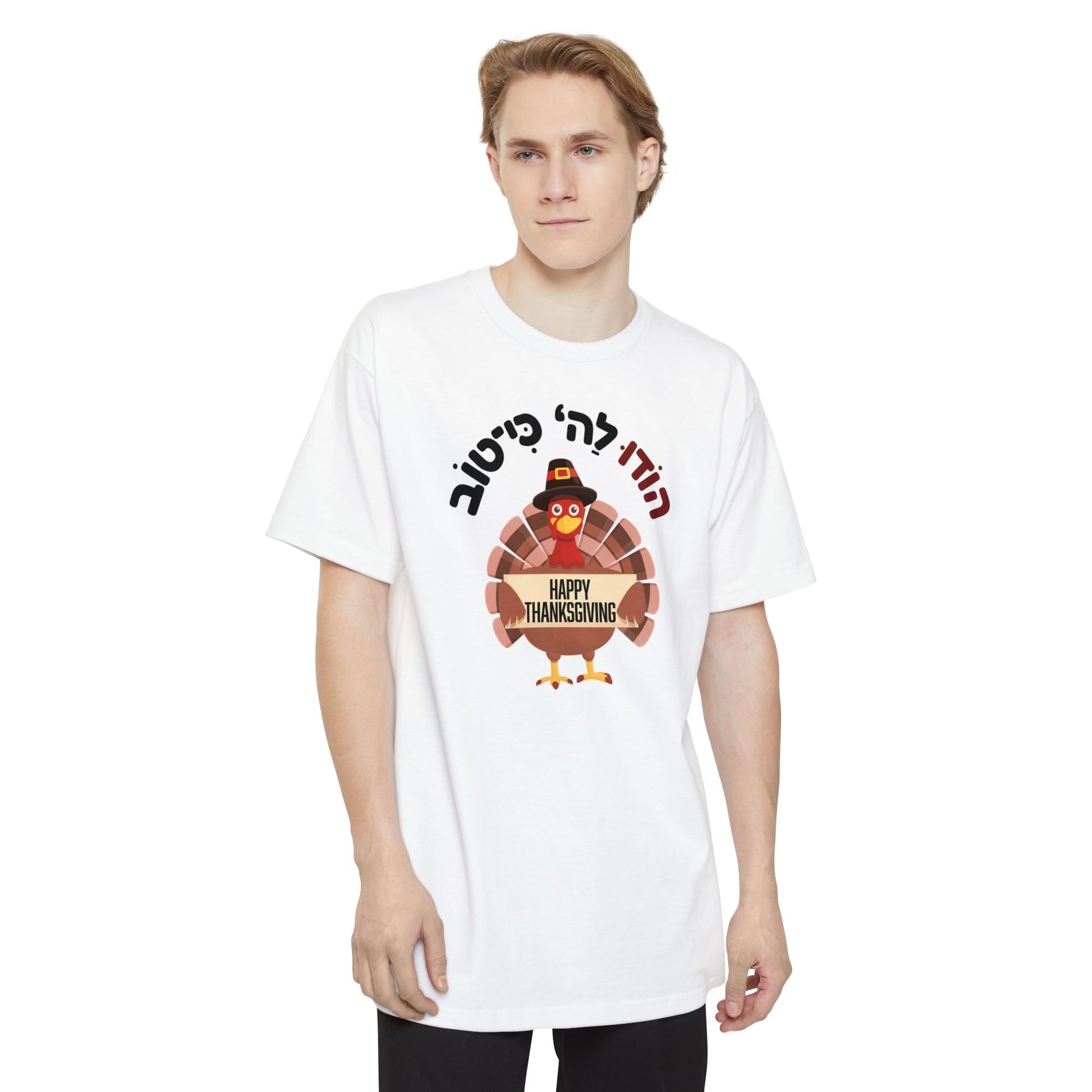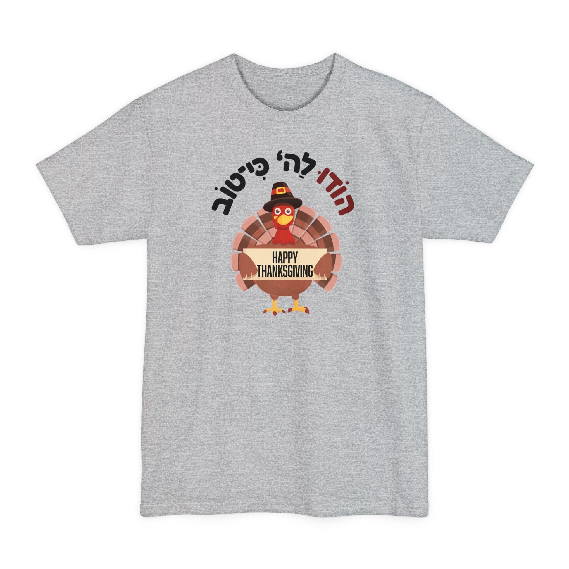 Our “הוֹדוּ לַה‘ כִּי־טוֹב / Happy Thanksgiving” t-shirt brings together gratitude, humor, and a little linguistic flair. In Hebrew, Hodu means both “give thanks” and “turkey,” making this the most delightfully double-entendre tee at your Thanksgiving table.